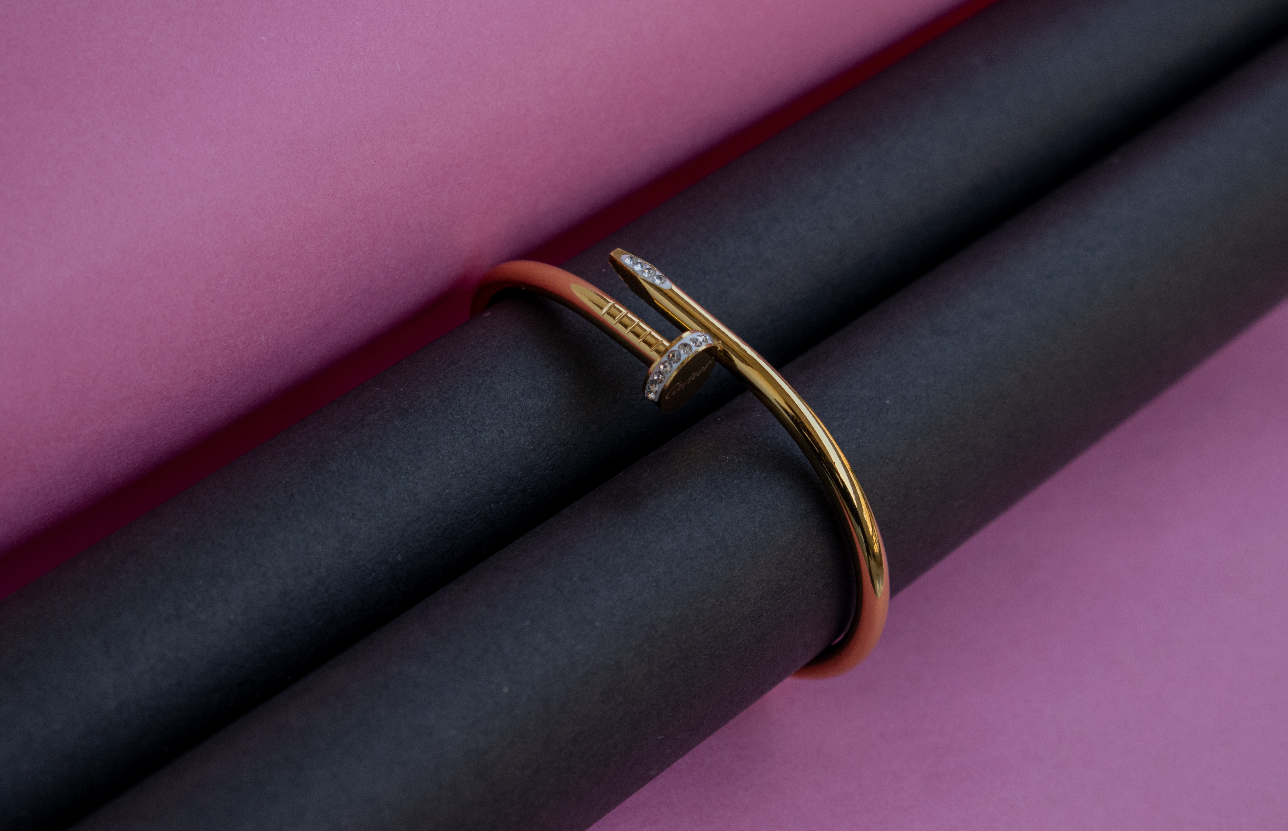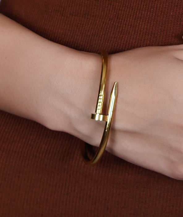 A bold nail-inspired cuff crafted in high-shine anti-tarnish gold. Minimal, modern, and unmistakably powerful.