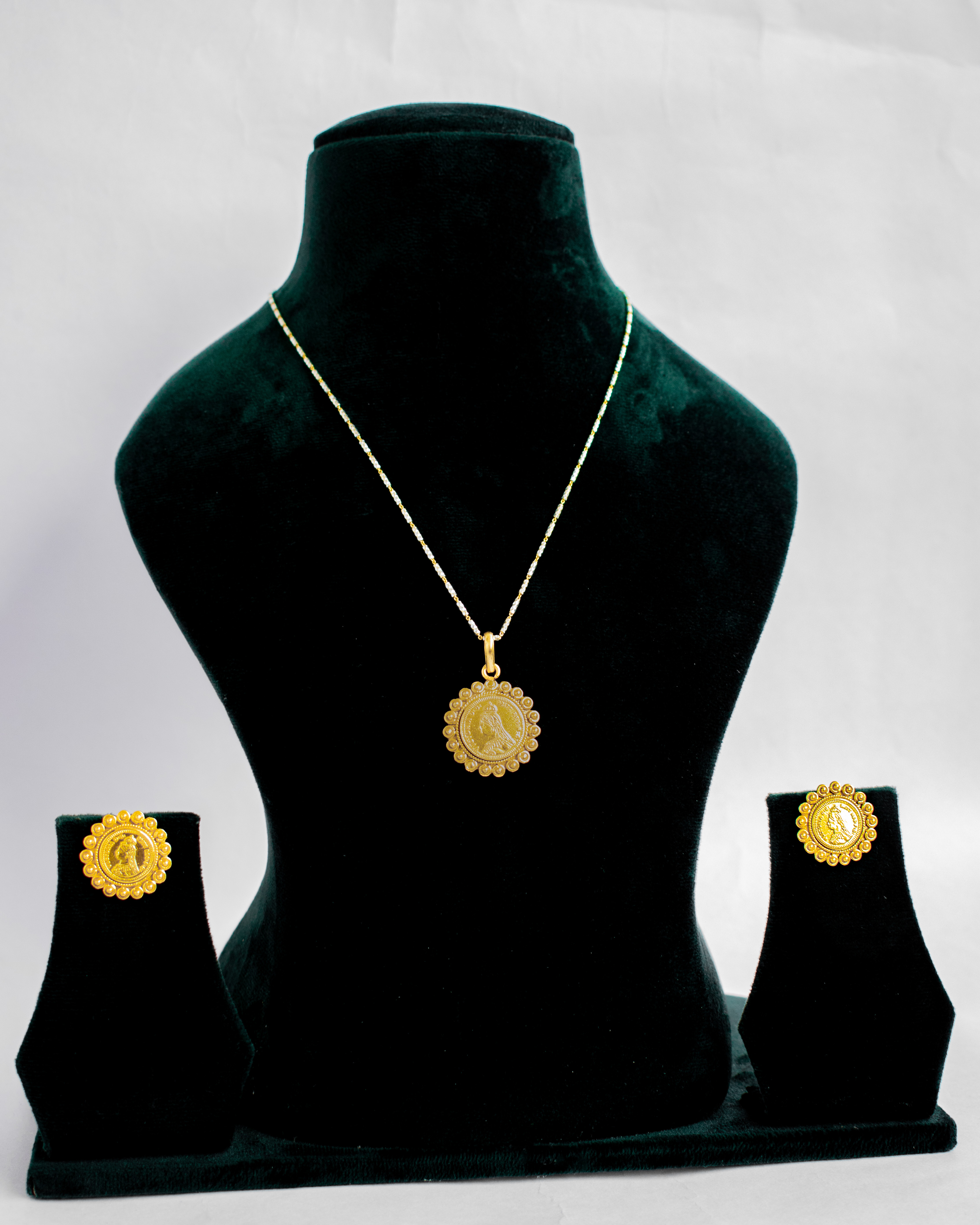 Elegant 925 silver pendant and earrings set with a classic gold-plated coin design, inspired by royal Indian heritage. Lightweight, skin-friendly, and timeless—perfect for festive wear, weddings, pooja, and ethnic styling. A graceful choice for gifting and everyday elegance.