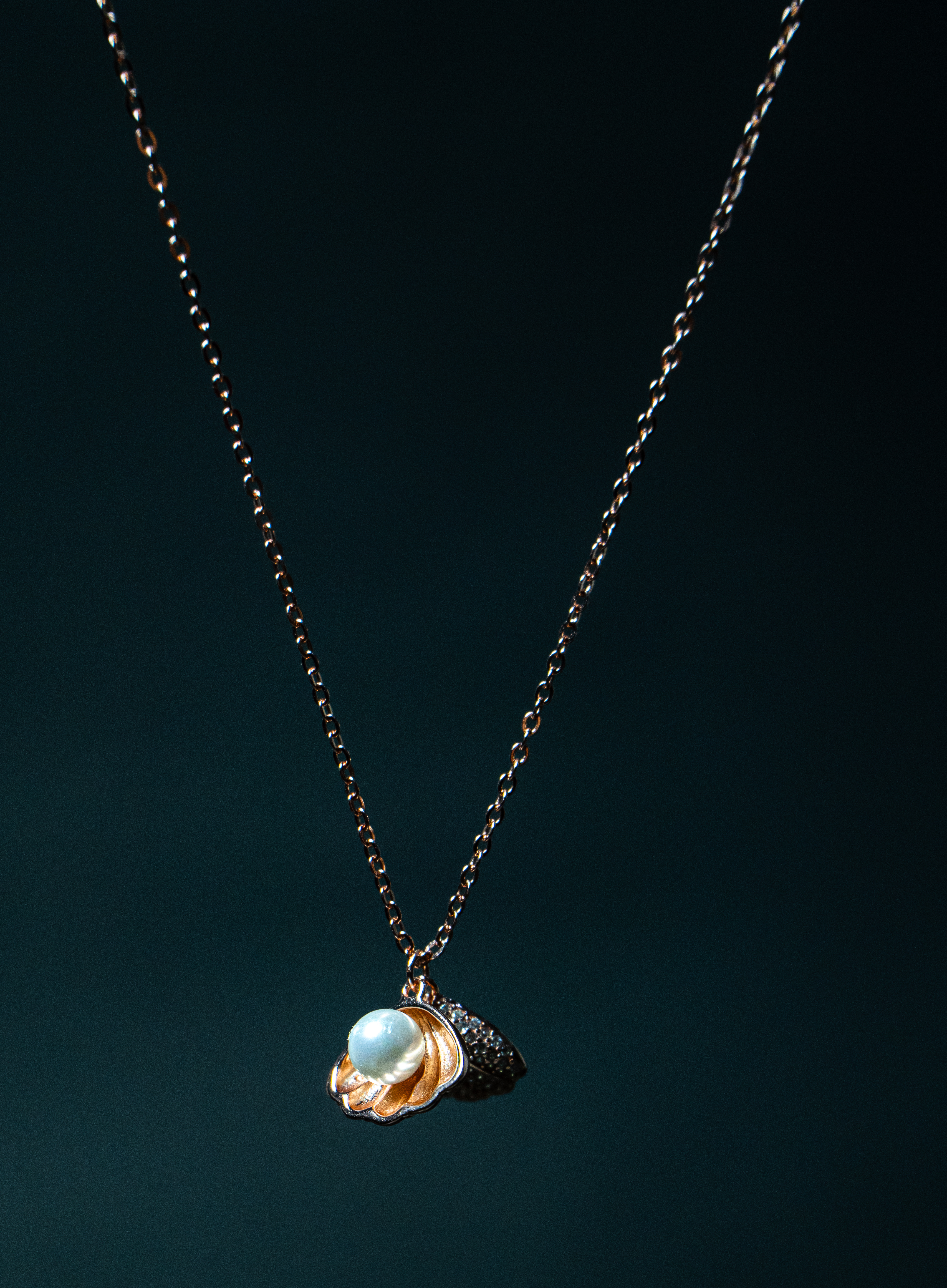 Born from the depths of the sea, this pearl-in-shell pendant captures nature’s most beautiful mystery. A luminous pearl rests inside a delicately crafted shell, symbolizing elegance, protection, and timeless grace. Finished in soft rose-gold tones with sparkling accents, this piece is made for women who shine effortlessly.