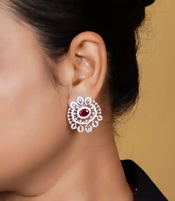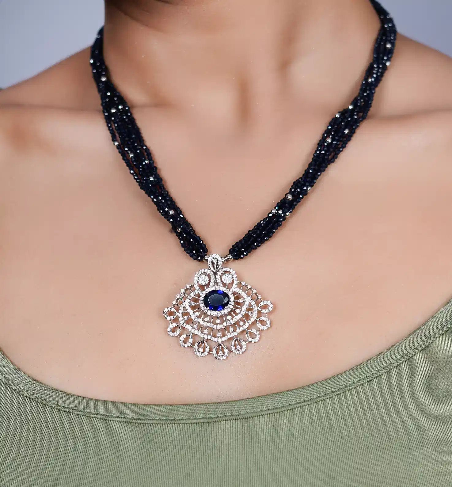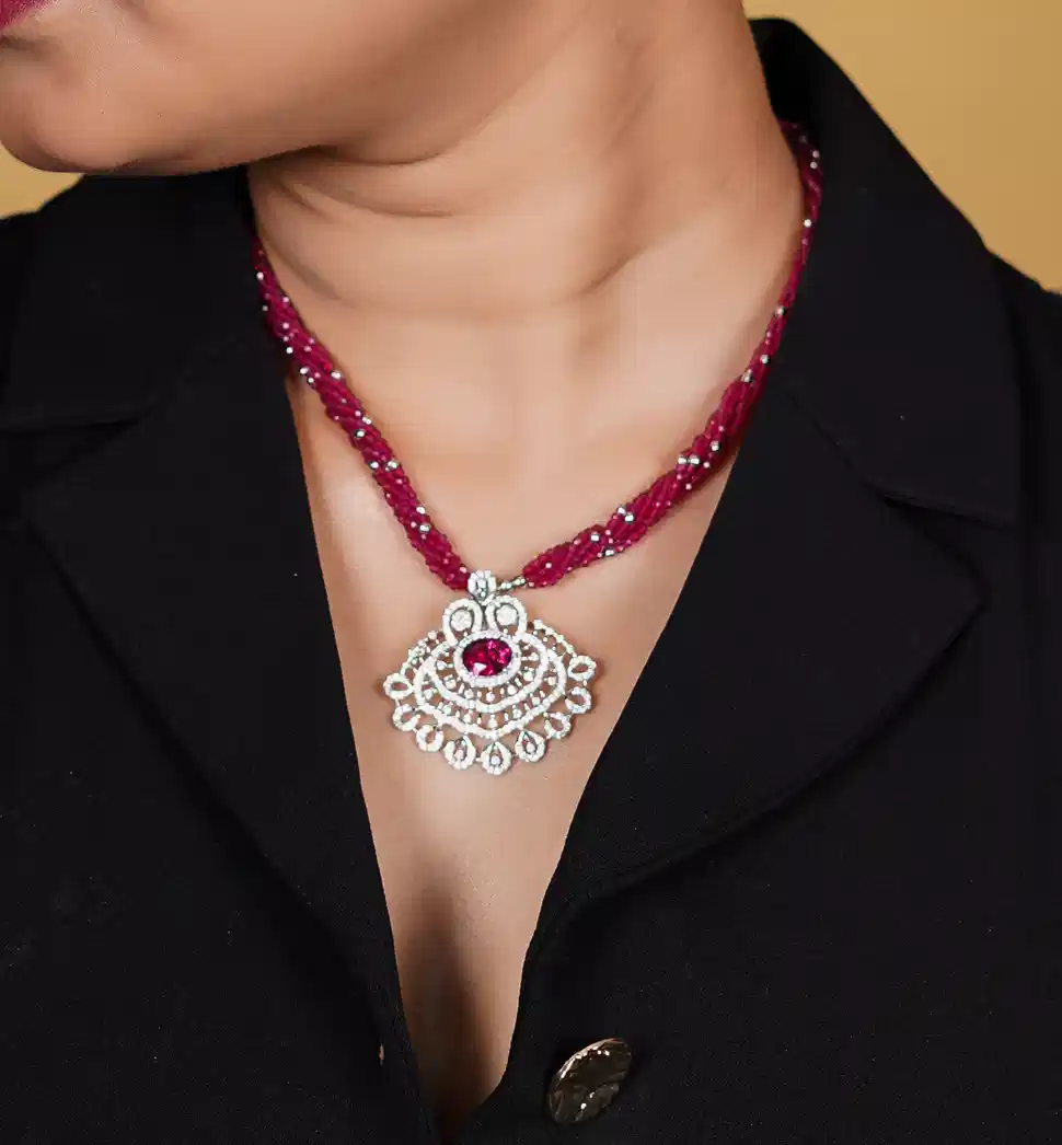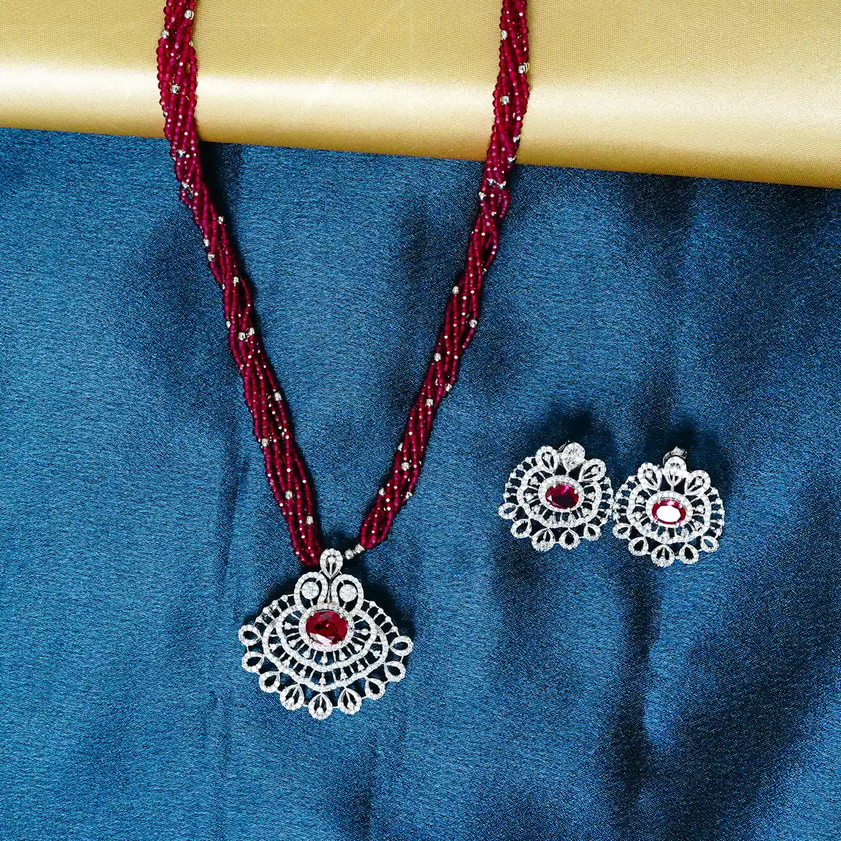 This elegant Dori set blends rich red beads with a radiant ruby-style pendant, creating a look that is bold, graceful, and timeless