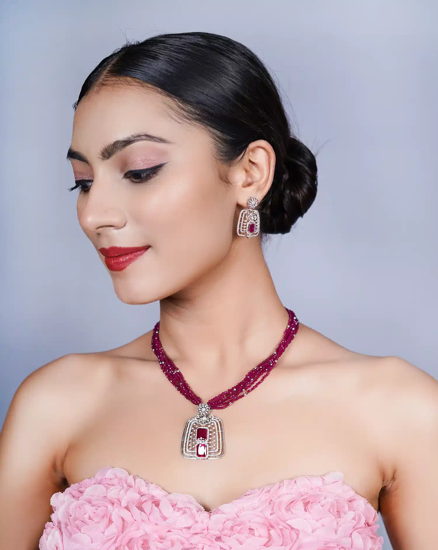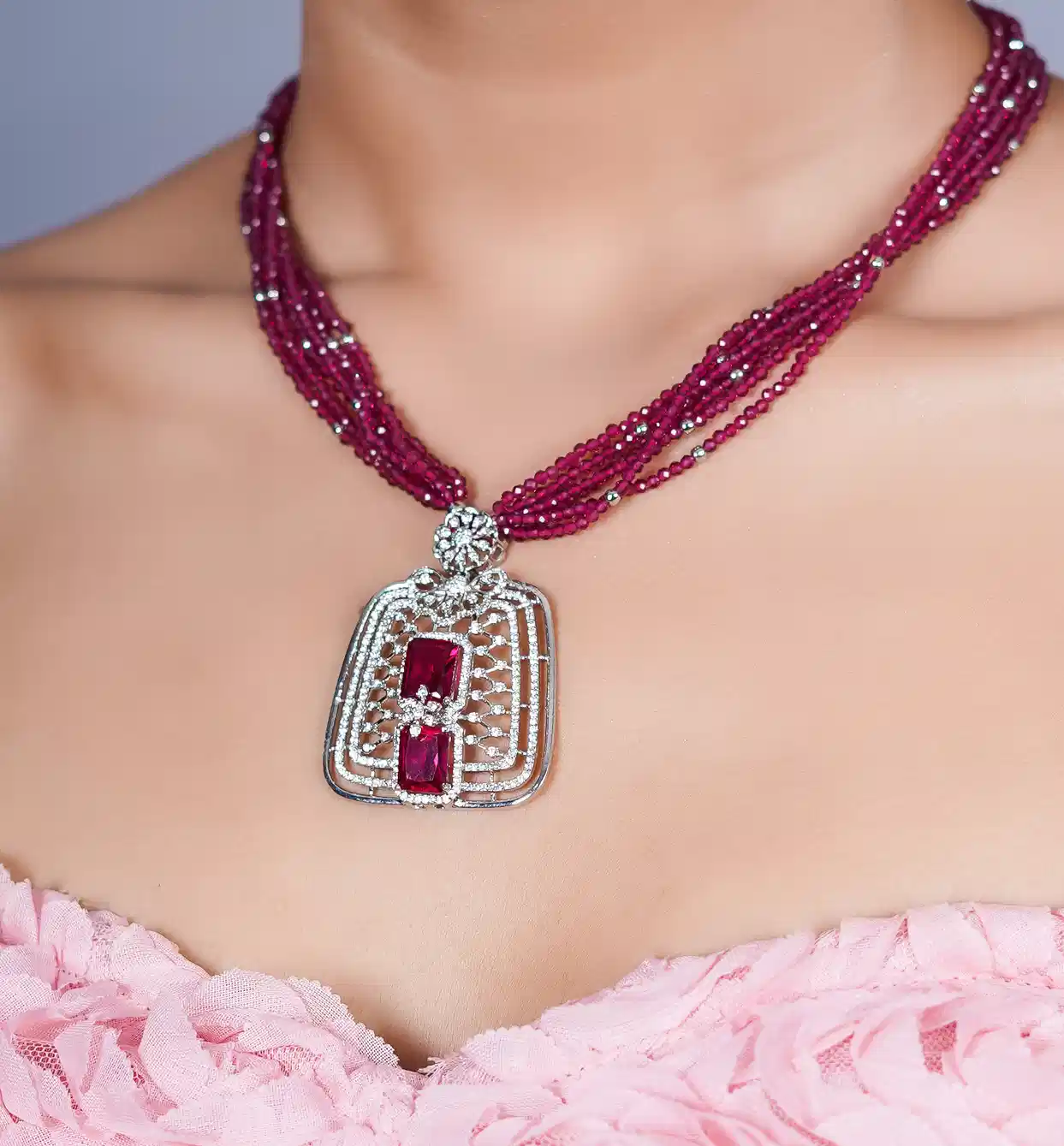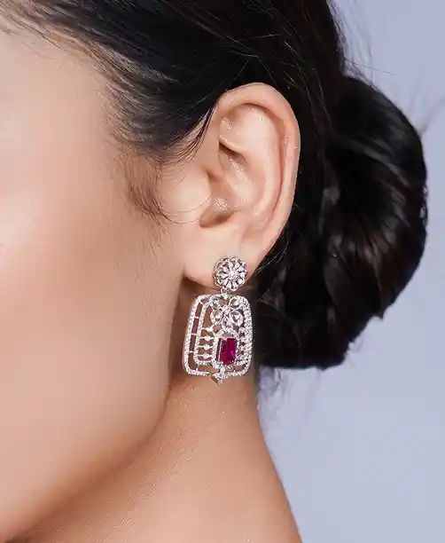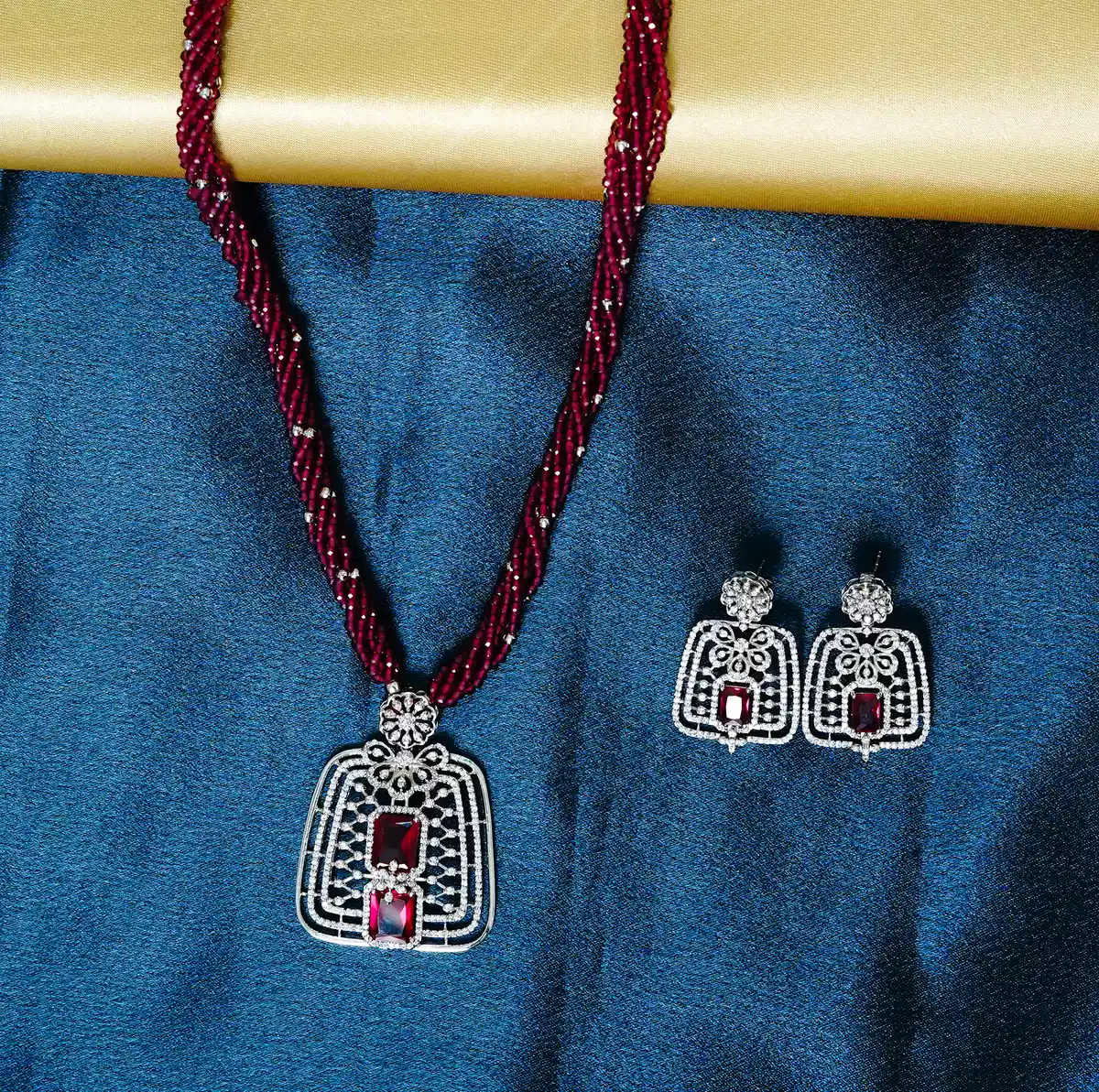 Where tradition meets the extraordinary. This set features an intricate "jali" or lattice-style pendant, hand-finished in pure silver and accented with deep red stones that glow with every turn. The matching earrings mirror the pendant’s geometric grace, making it an ideal choice for weddings, anniversaries, or grand celebrations.